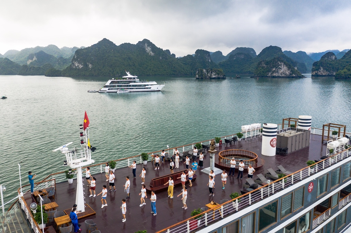 - Plenty of onboard and offboard activities: All activities are well planned in advance, such as kayaking, taking a bamboo boat, visiting a cave, swimming, cycling, cooking class, sunset party, fishing squid, Taichi/Vovinam/Yoga.