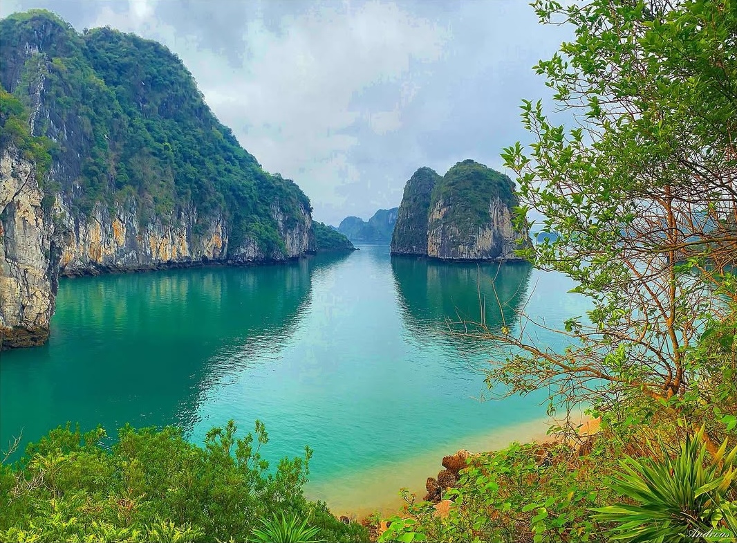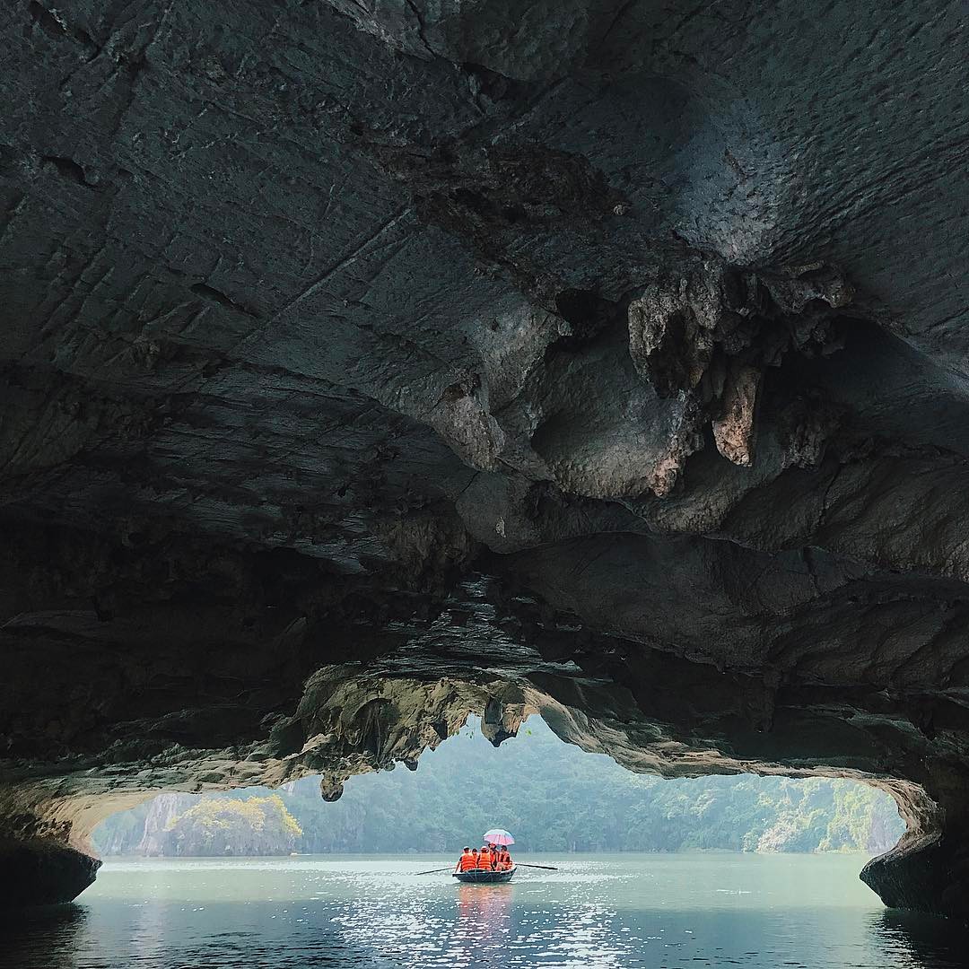 Luon Cave is a small stone tunnel that opens into a lush green lake, surrounded by high cliffs. To get inside, visitors can kayak or take a bamboo boat rowed by locals. Inside the lake is quiet, only the sound of birds chirping and oars splashing in the water. This is the ideal place to feel the stillness and untouched nature of the bay.
